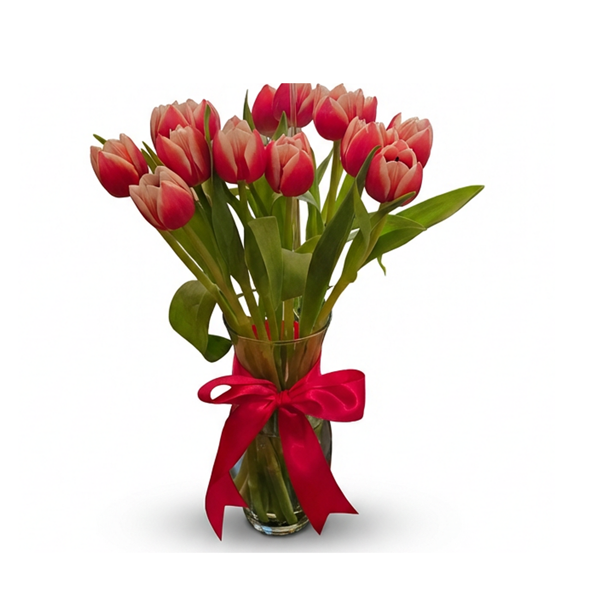 Elegant arrangement composed of long-stem pink tulips, carefully arranged to create a clean, vertical silhouette in a clear glass vase. Designed with a soft, refined aesthetic that highlights the natural beauty of the tulips for a modern and timeless look.