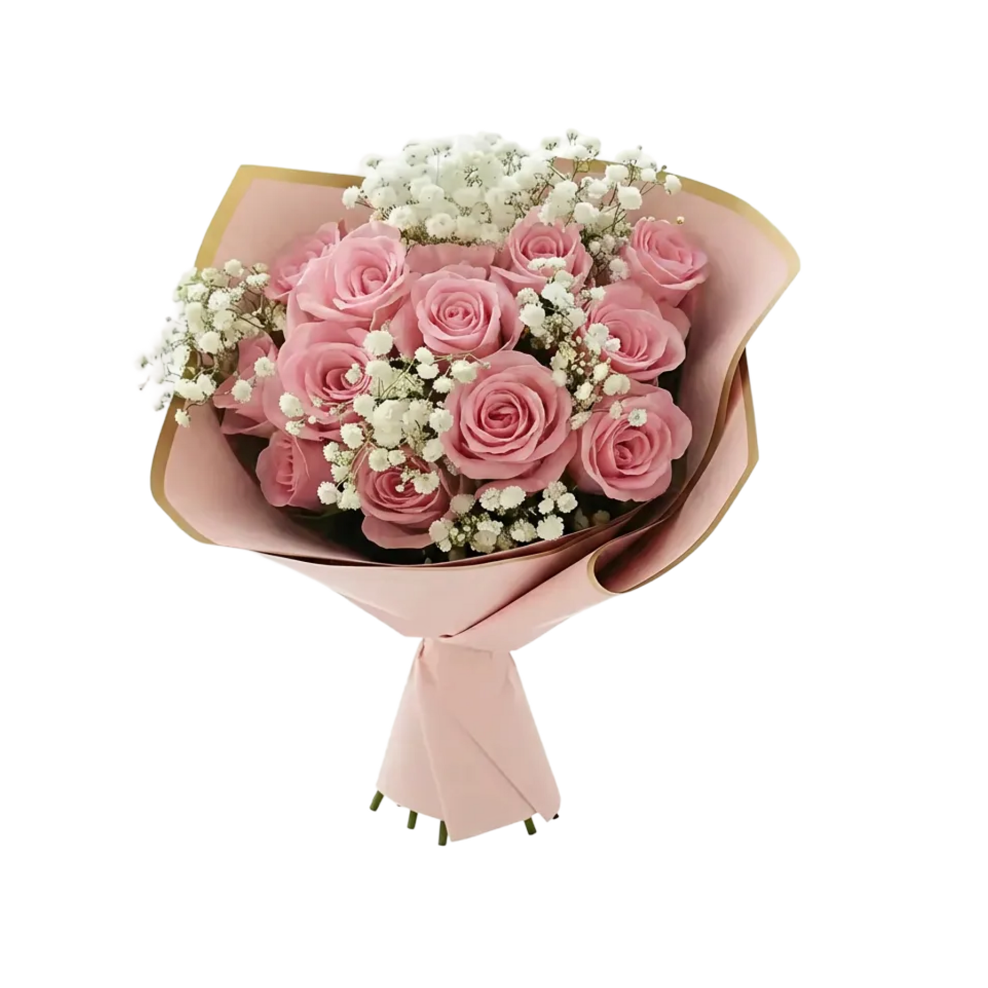 Classic bouquet composed of a dozen long-stem pink roses, accompanied by light green foliage. It is wrapped in decorative paper in neutral tones with an elegant finish, creating a traditional and timeless presentation ideal for expressing love and admiration. Standard includes 12 roses, Deluxe 18 roses, Premium 24 roses, and Grand Luxe showcases an opulent 50 roses for a truly breathtaking statement.