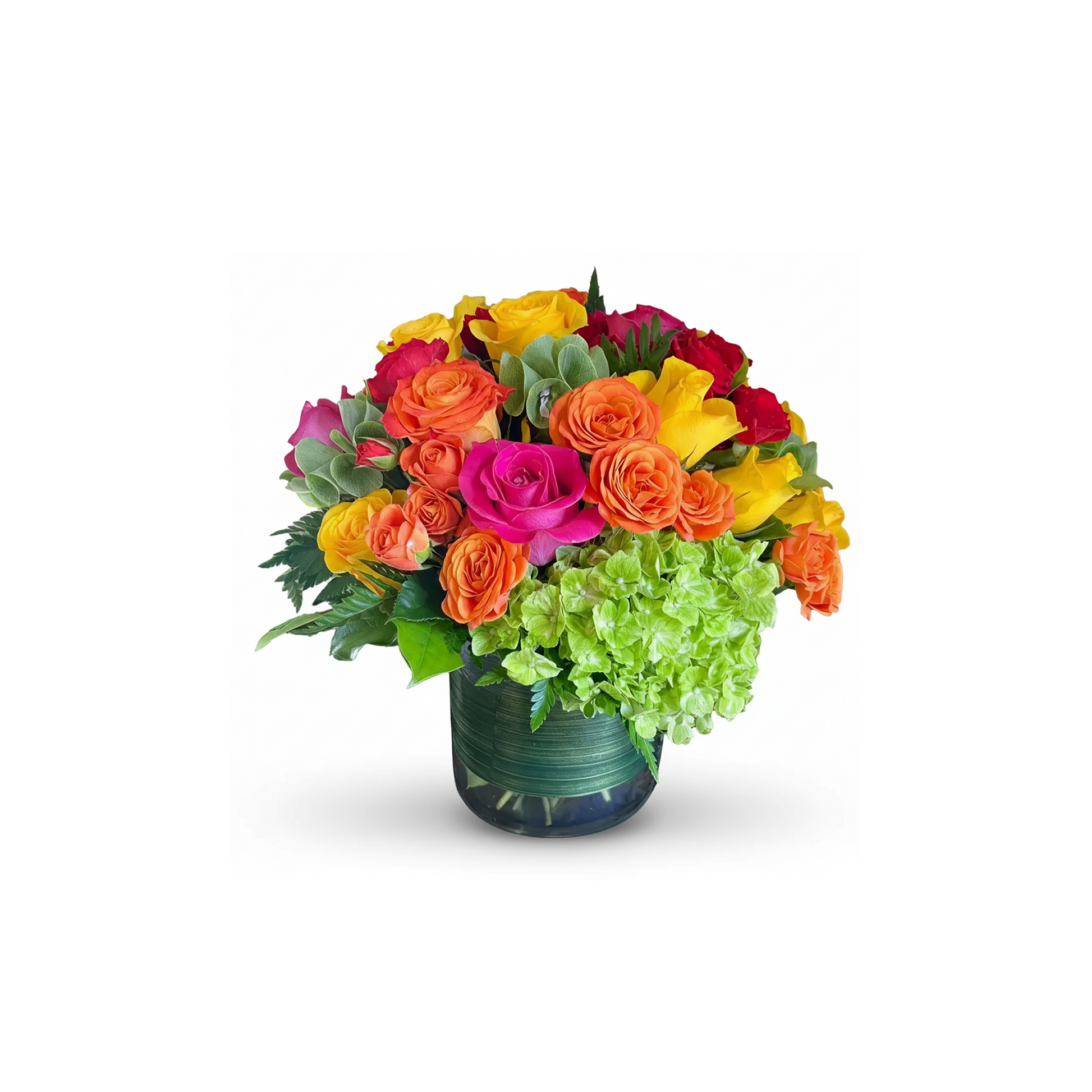 Vibrant floral arrangement composed of roses, tropical flowers, green hydrangeas, and mixed blooms in shades of orange, pink, green, and fuchsia. It is presented in a clear glass vase, creating a bold and energetic composition.