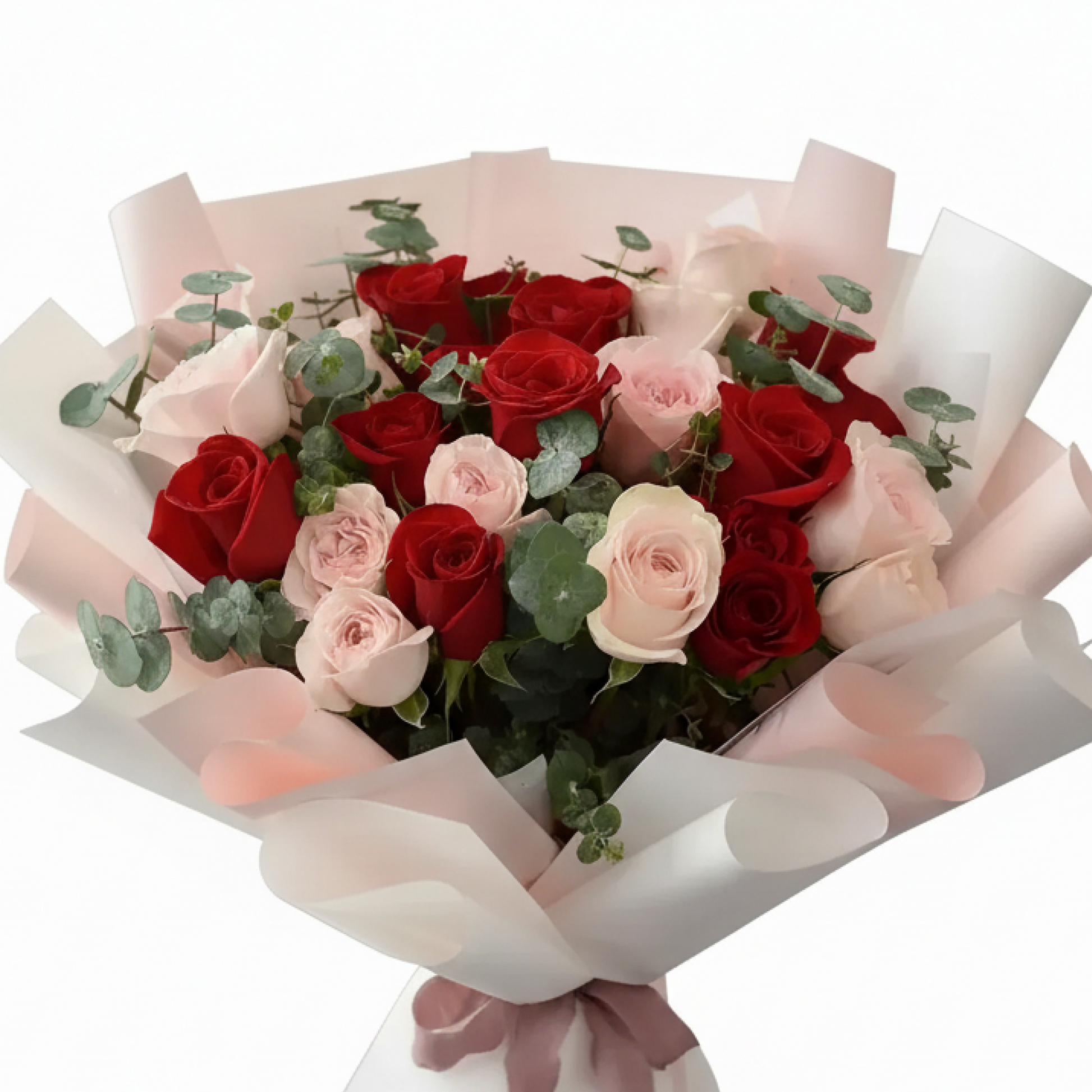 Romantic bouquet composed of roses in red, white, and pink tones, harmoniously combined to create contrast and depth. It is wrapped in light decorative paper with a soft bow, achieving a delicate, romantic, and visually balanced presentation. Standard includes 12 roses, Deluxe 18 roses, Premium 24 roses, and Grand Luxe showcases an opulent 50 roses for a truly breathtaking statement.