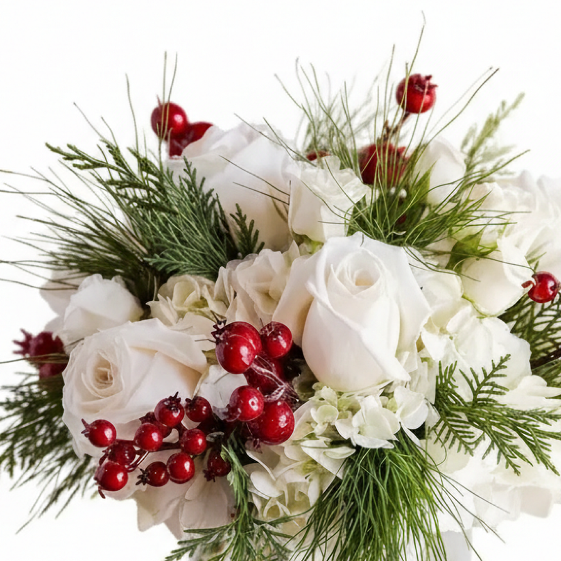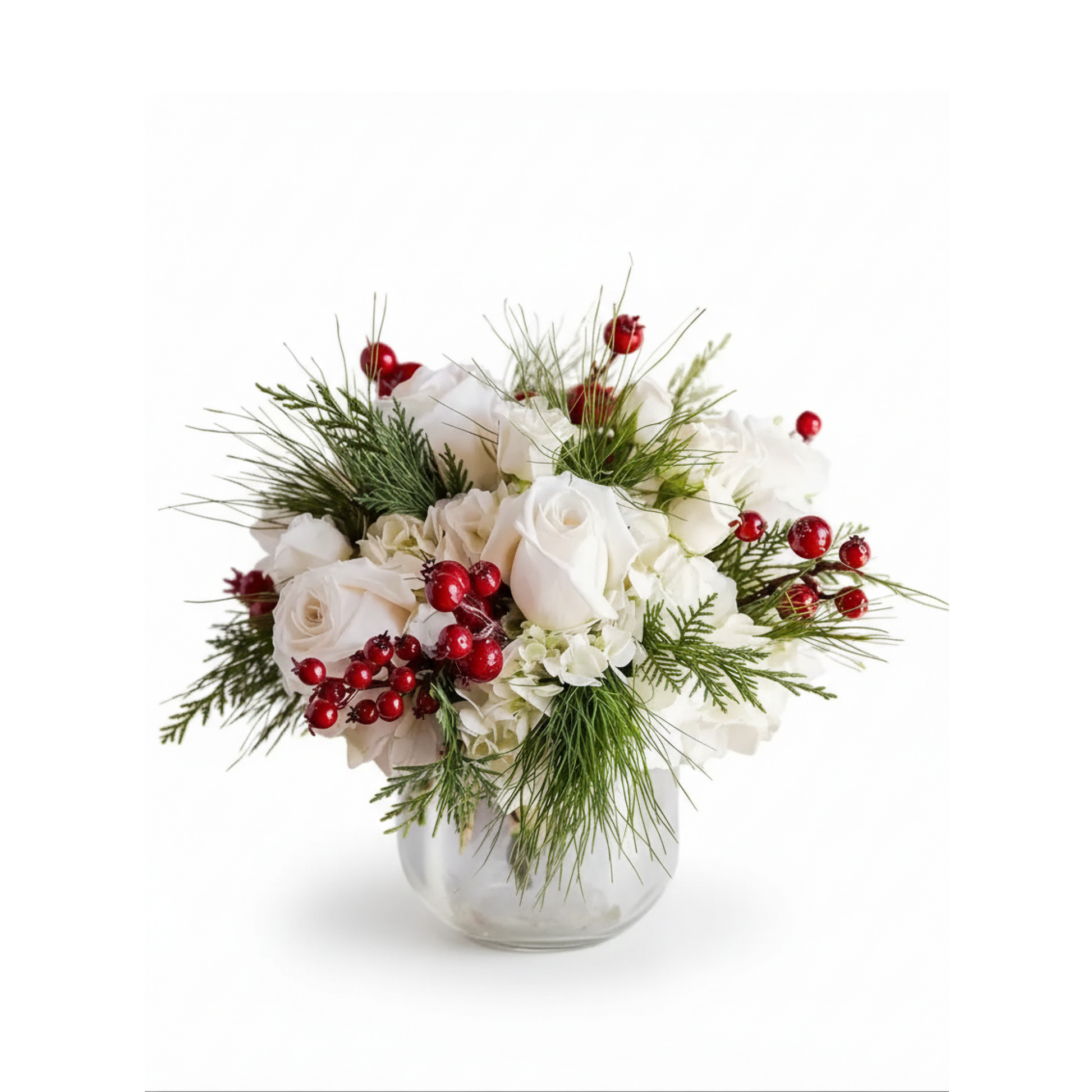 Winter floral arrangement composed of white roses, decorative red berries, and pine-like green foliage, with dry branch accents that add texture. It is presented in a clear glass vase, creating a fresh and sophisticated composition with a natural winter touch.
