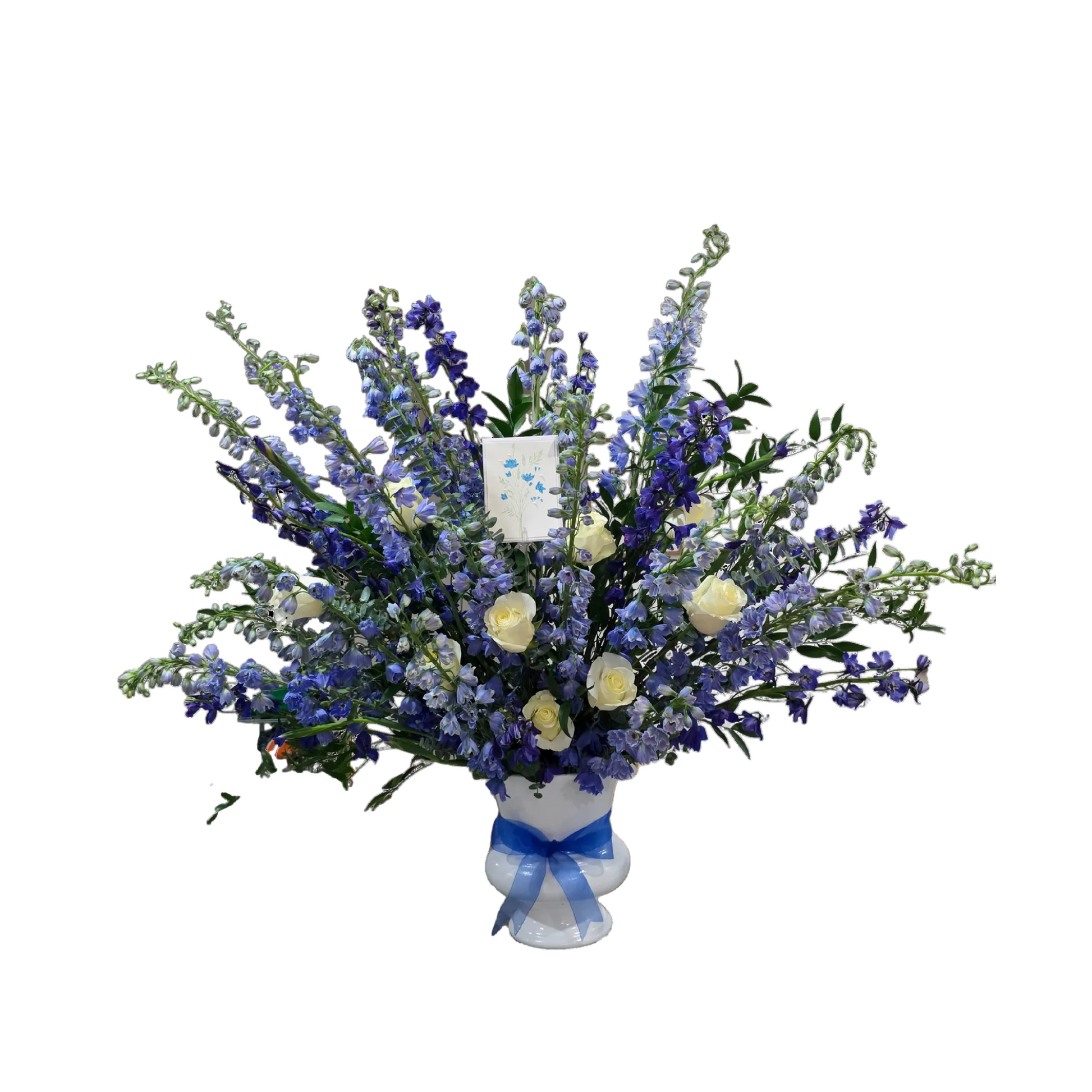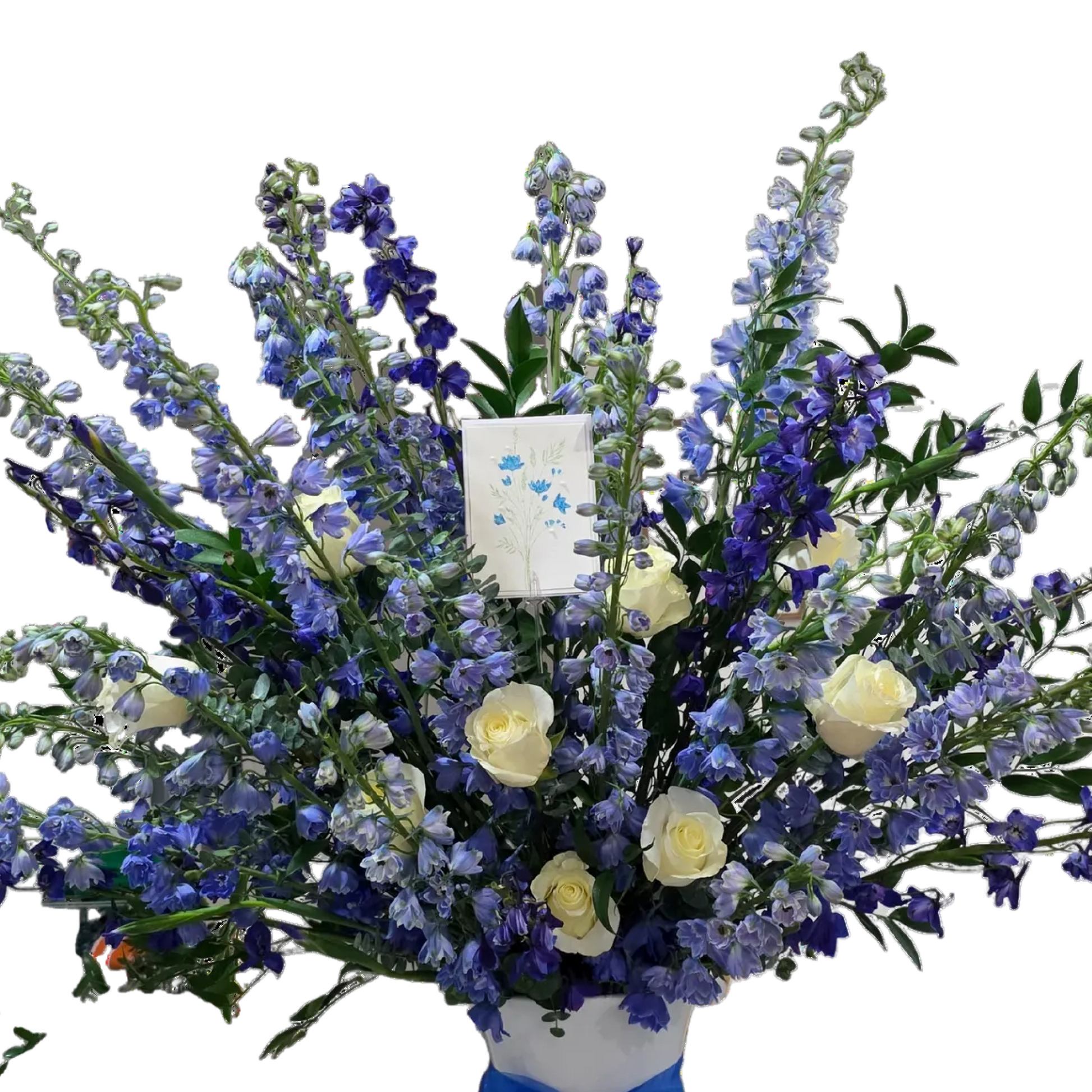 Majestic floral arrangement composed of white flowers, blue blooms, purple flowers, and green foliage, with branches that add height and volume. It is presented in a blue decorative vase, creating an impressive and refined composition.