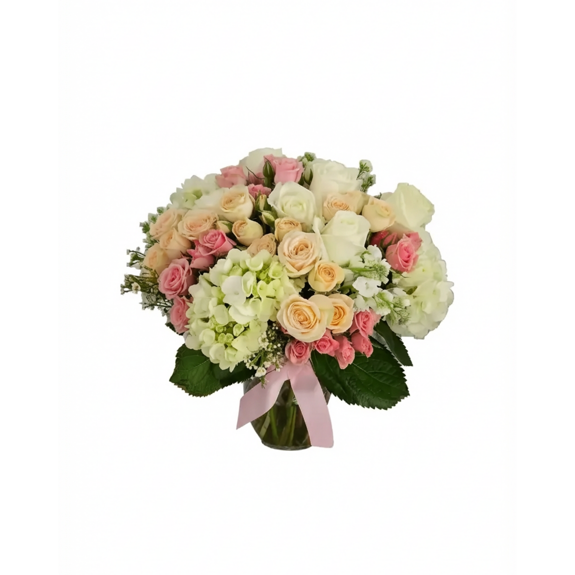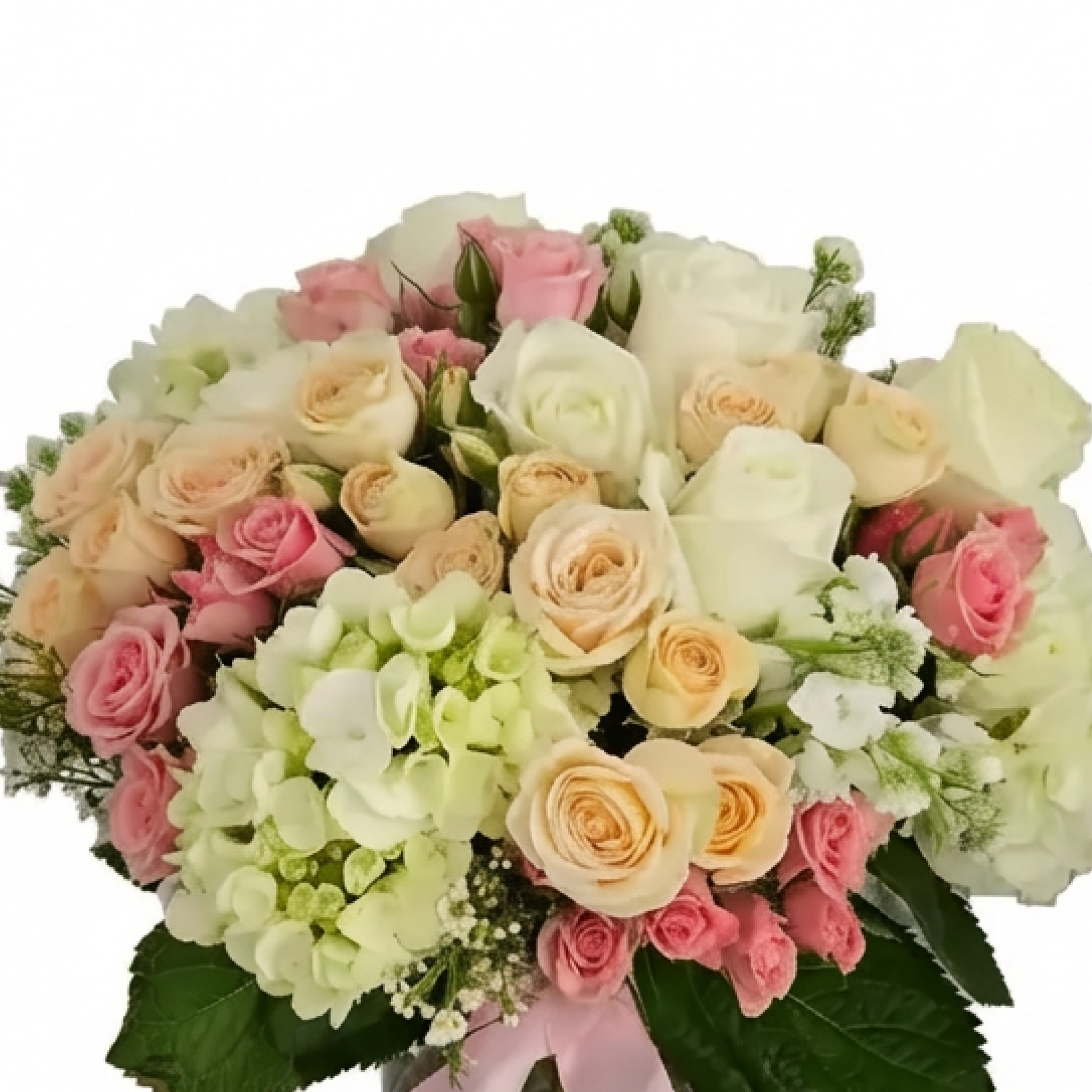 Classic floral arrangement composed of roses in cream and white tones, accompanied by soft green foliage. It is designed in a low glass vase, creating an elegant and timeless composition suitable for any occasion.