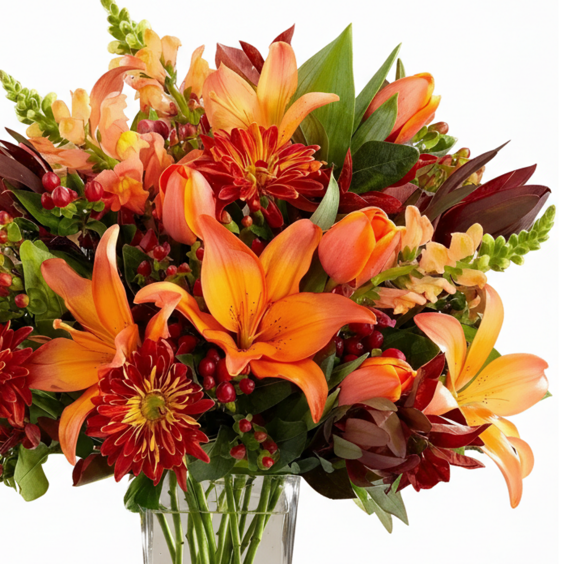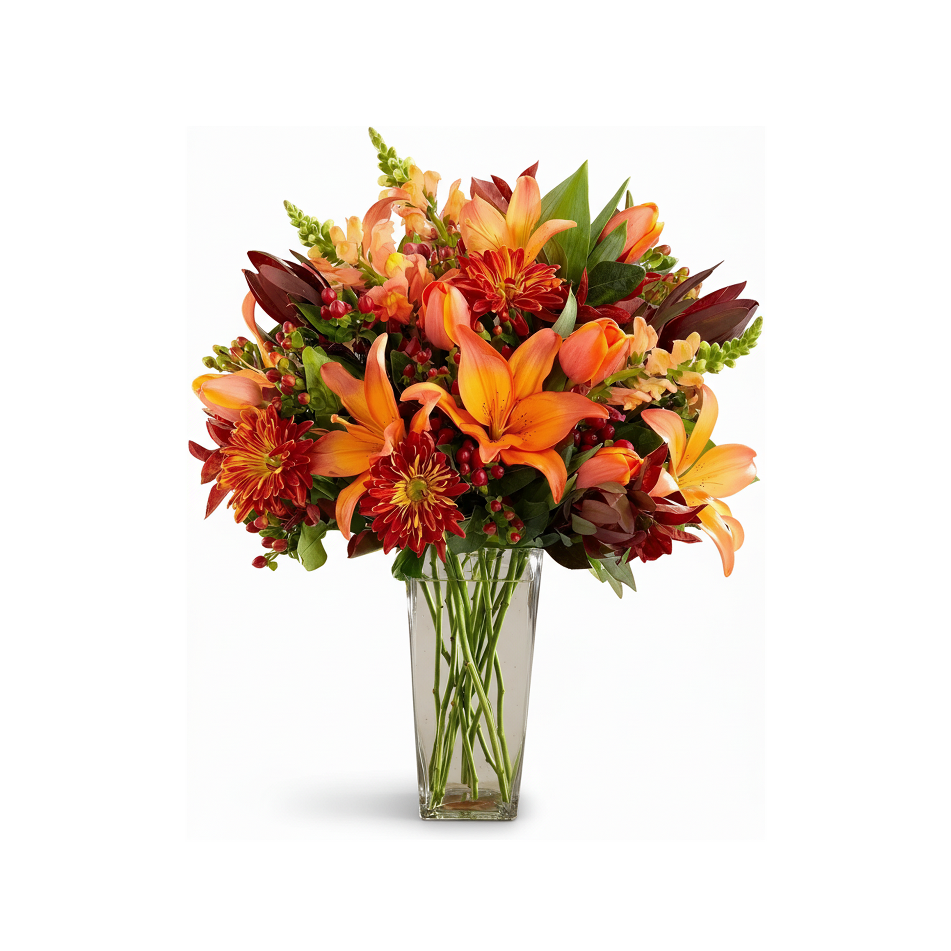 Lush floral arrangement combining orange lilies, chrysanthemums, and autumn flowers in shades of orange, red, and yellow, accompanied by green foliage. It is presented in a tall clear glass vase, creating a vertical composition full of volume and color inspired by fall.