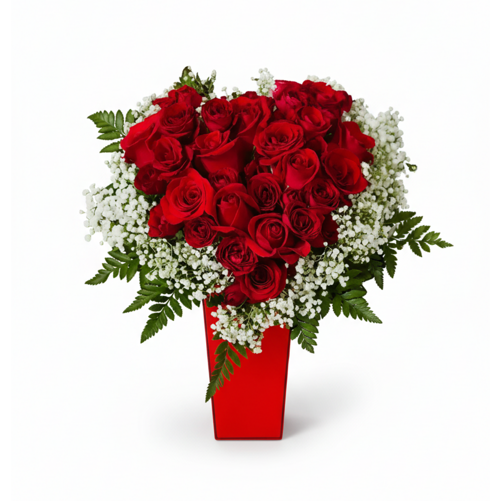 Intense floral arrangement composed of vibrant red roses and green foliage. It is presented in a red rectangular vase, forming a bold and passionate composition that represents direct and sincere love.Standard includes 12 roses, Deluxe 18 roses, Premium 24 roses, and Grand Luxe features 50 roses for a truly unforgettable statement.