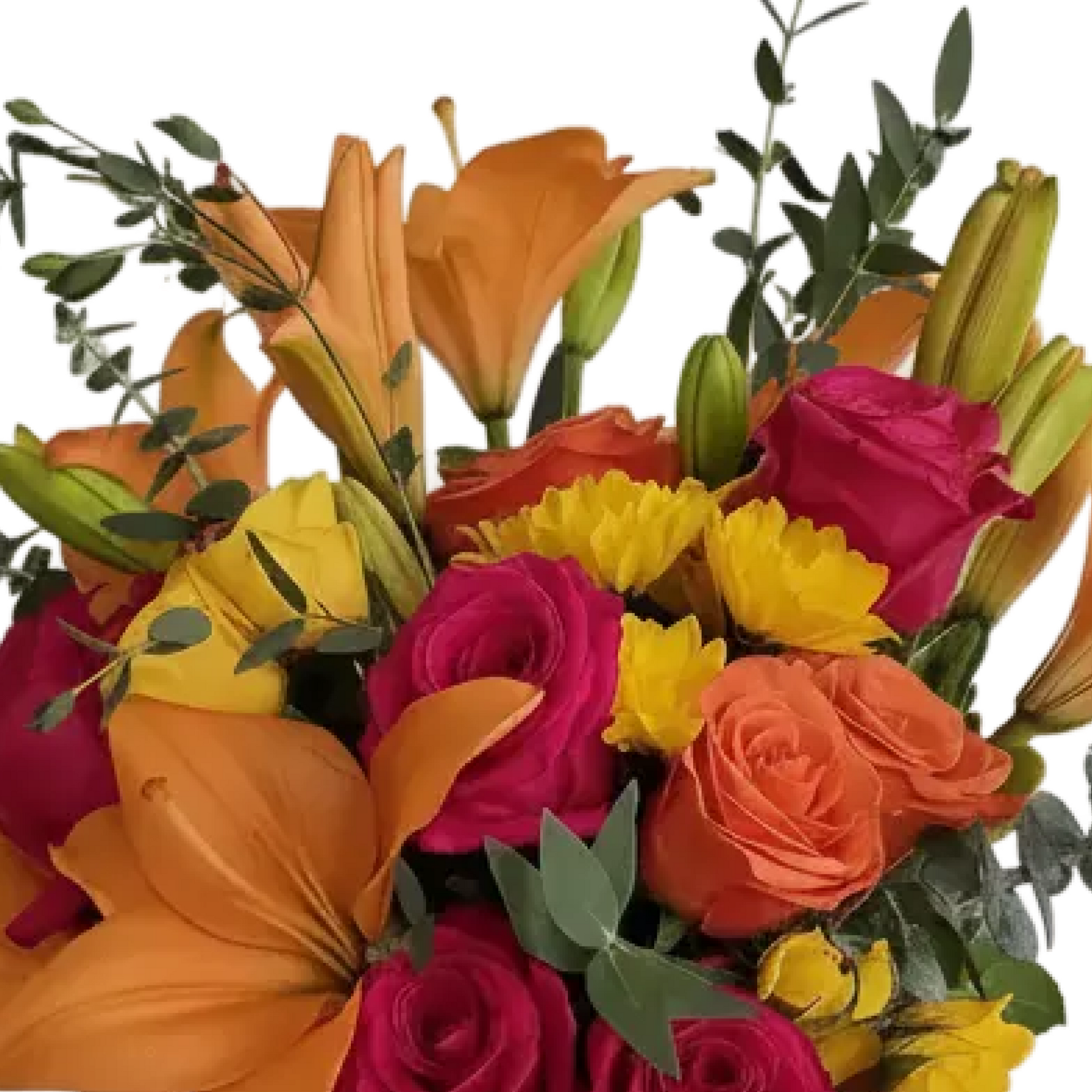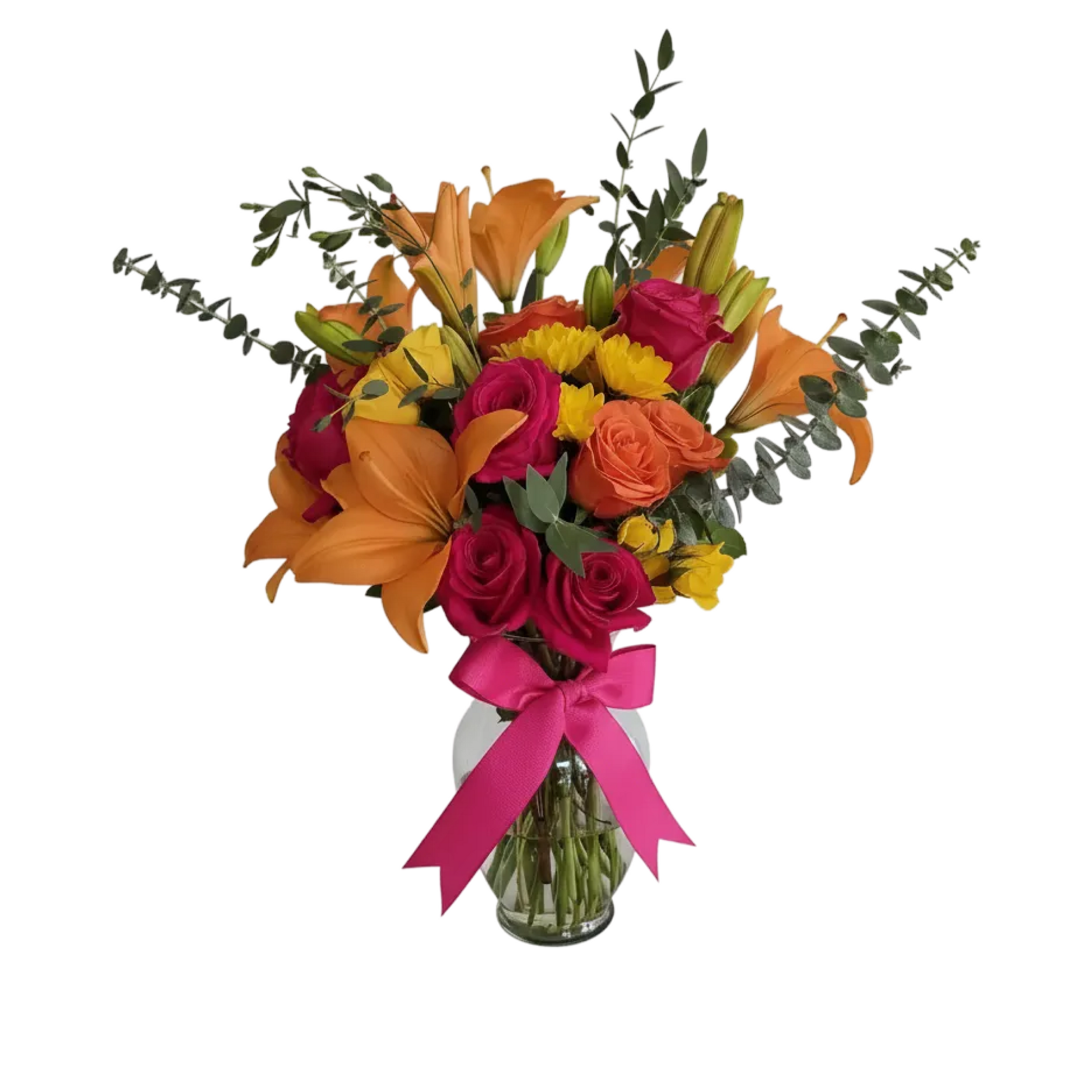 Eye-catching floral arrangement composed of red roses, orange roses, orange lilies, and green foliage. It is designed in a decorative vase with a ribbon, creating an expressive and festive composition.