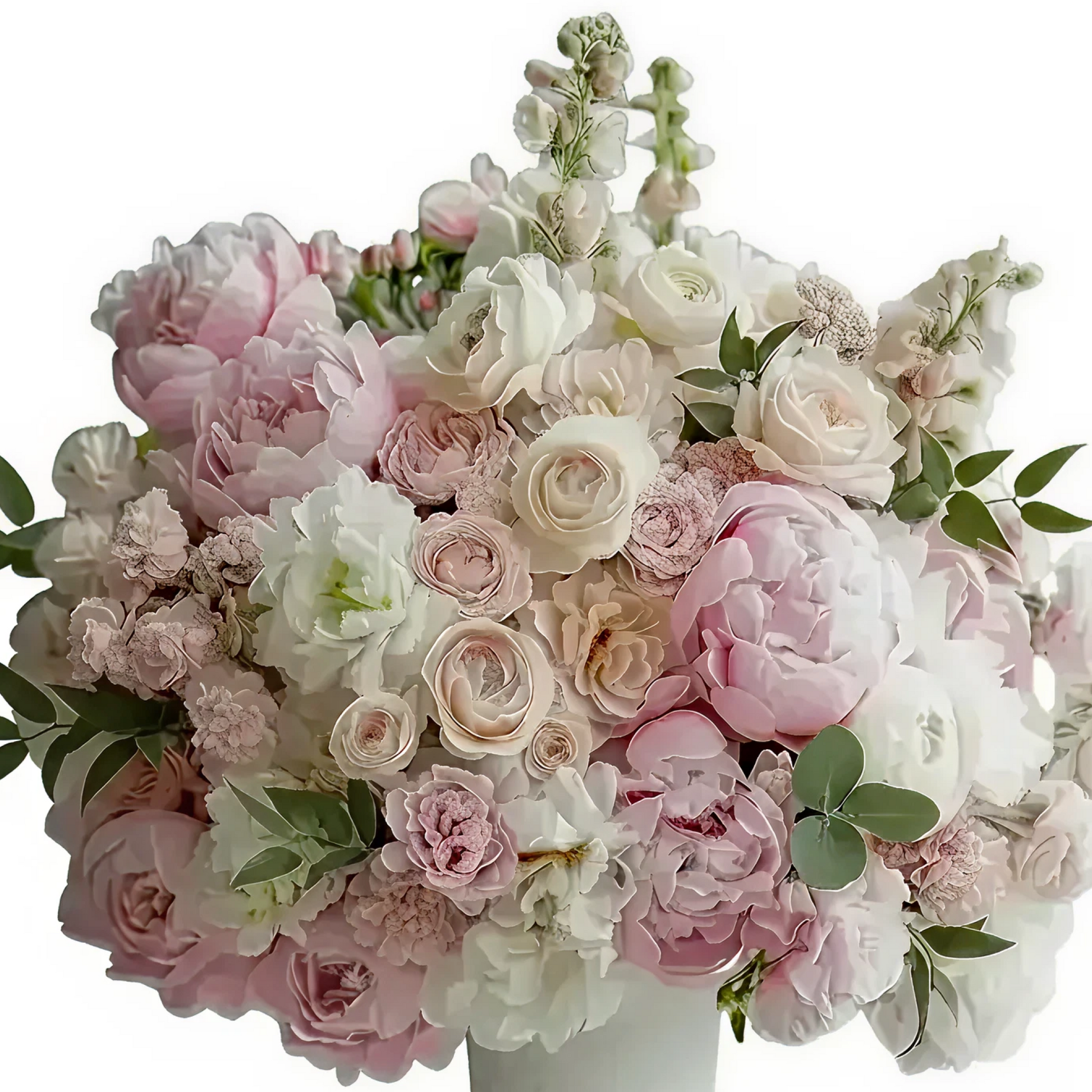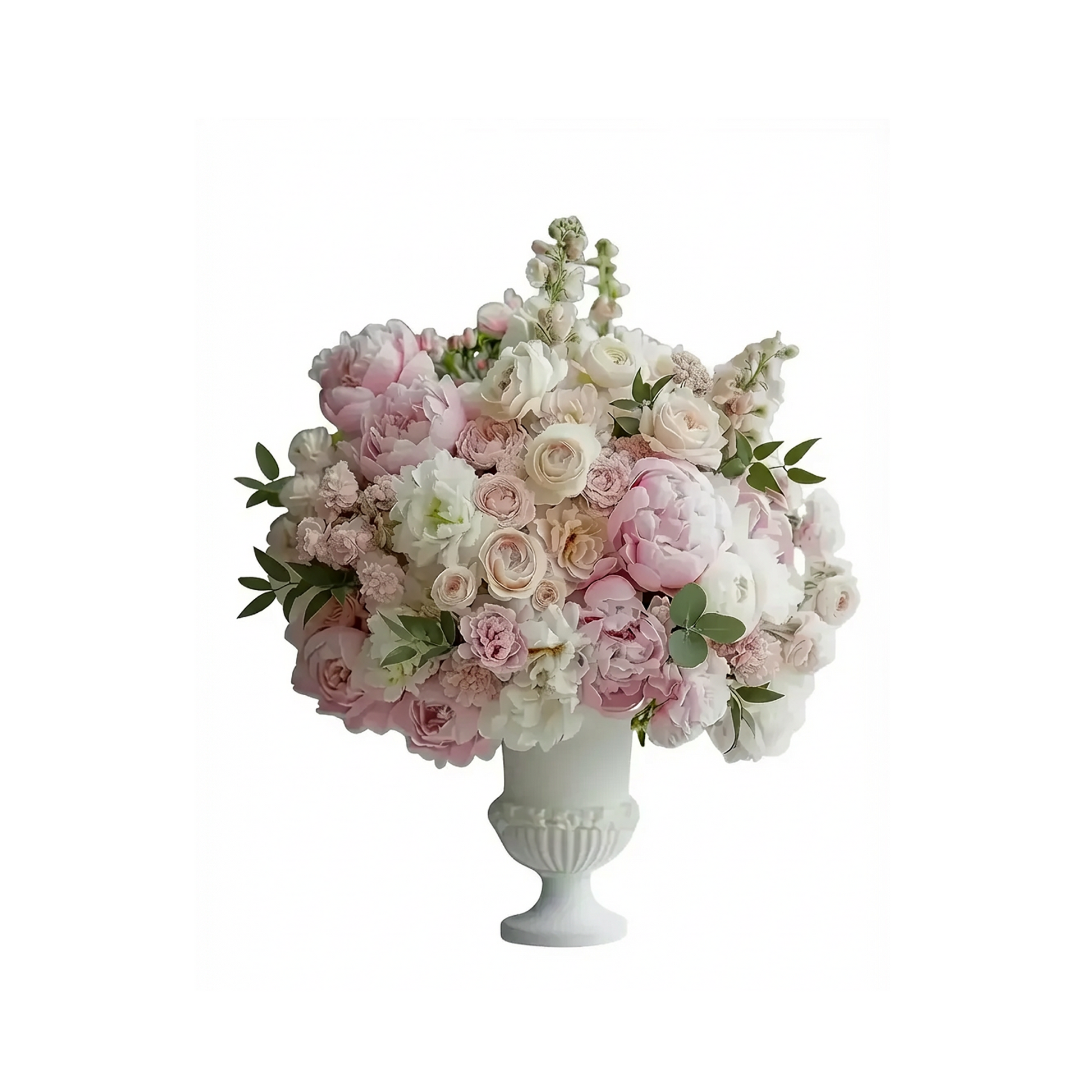 Sophisticated floral arrangement composed of pink hydrangeas, pink roses, and small accent flowers in soft tones, accompanied by green foliage. It is presented in a white decorative base with a classic style, creating an elegant, delicate, and visually striking composition.