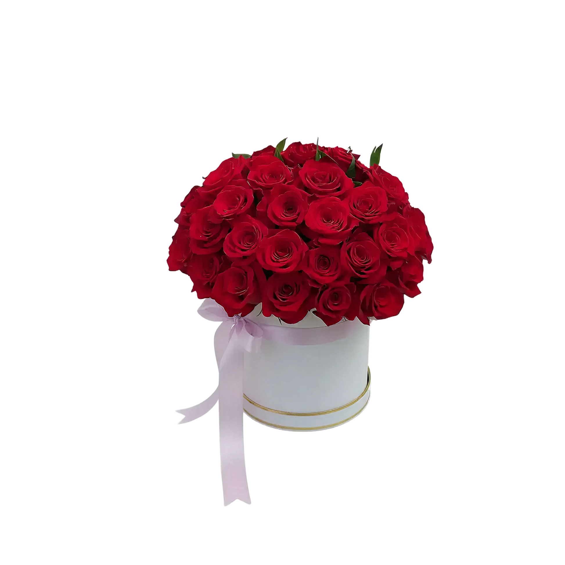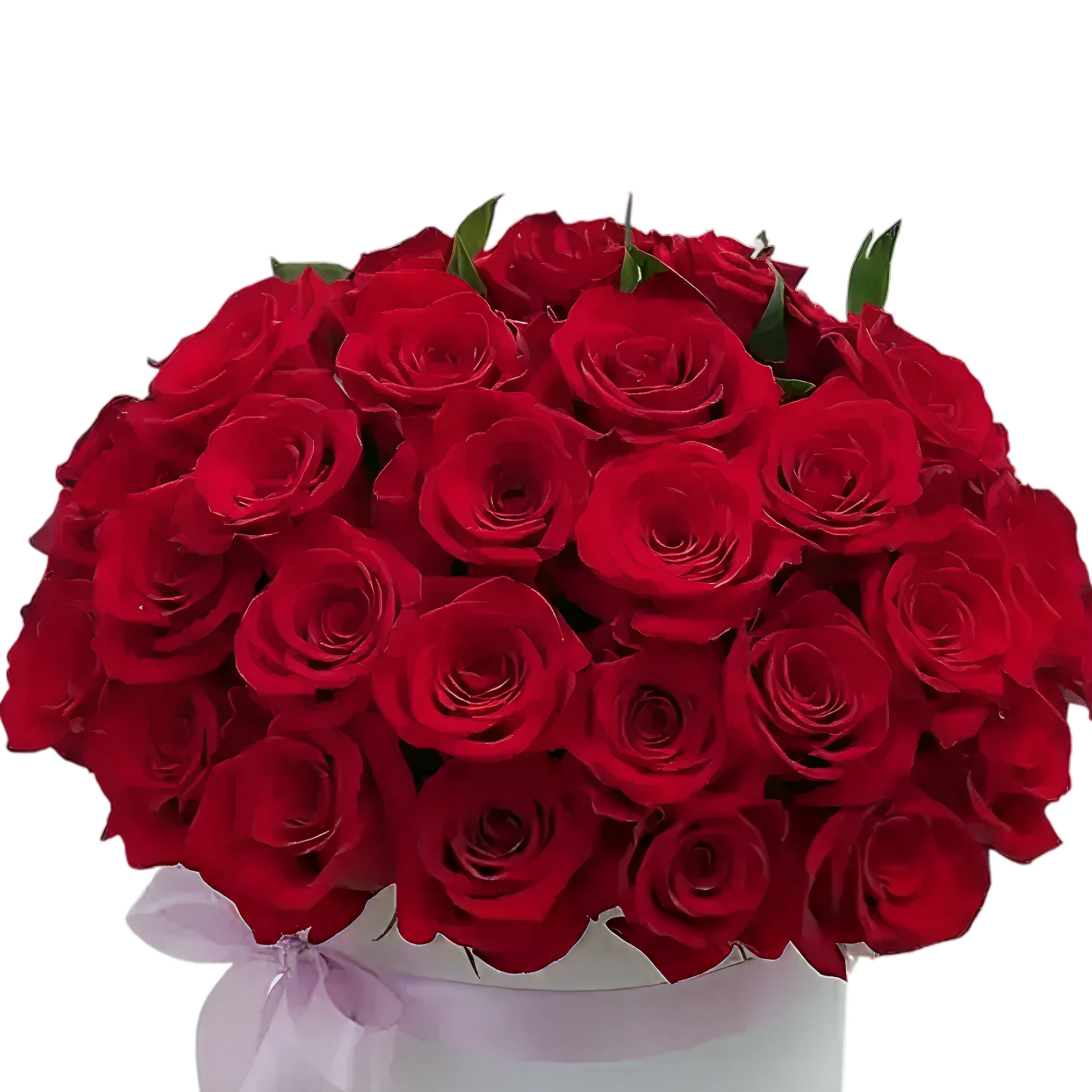 An elegant arrangement composed entirely of short-stem red roses, compactly and uniformly placed to form a perfectly shaped floral dome. The roses are arranged inside a luxury round rigid box in a light tone, finished with a deep red fabric ribbon, evoking classic Parisian sophistication. Standar (18 roses), Deluxe (32 roses), Premium (50 roses), Grand Luxe (99)