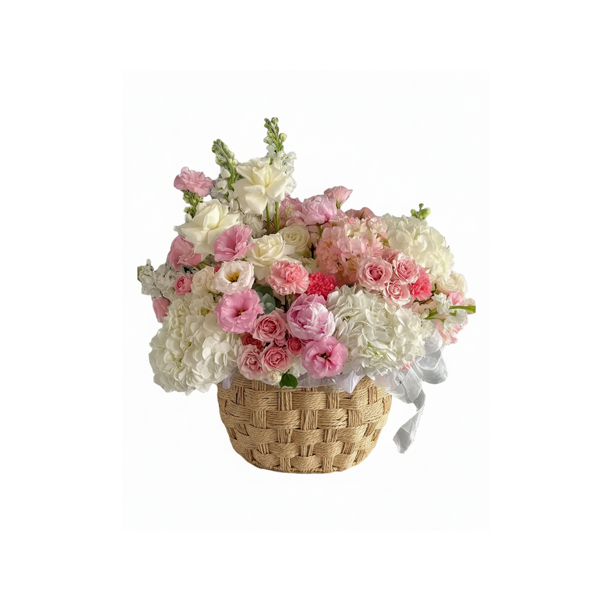 A soft and romantic design composed of light pink roses, spray roses, and delicate pastel blooms, accented with light greenery. Arranged in a light woven basket, creating a tender, feminine, and harmonious aesthetic.